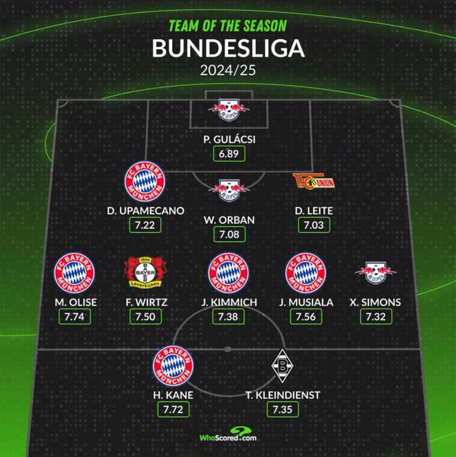 WhoScored德甲赛季最佳阵:凯恩等拜仁5将入选,维尔茨西蒙斯在列
